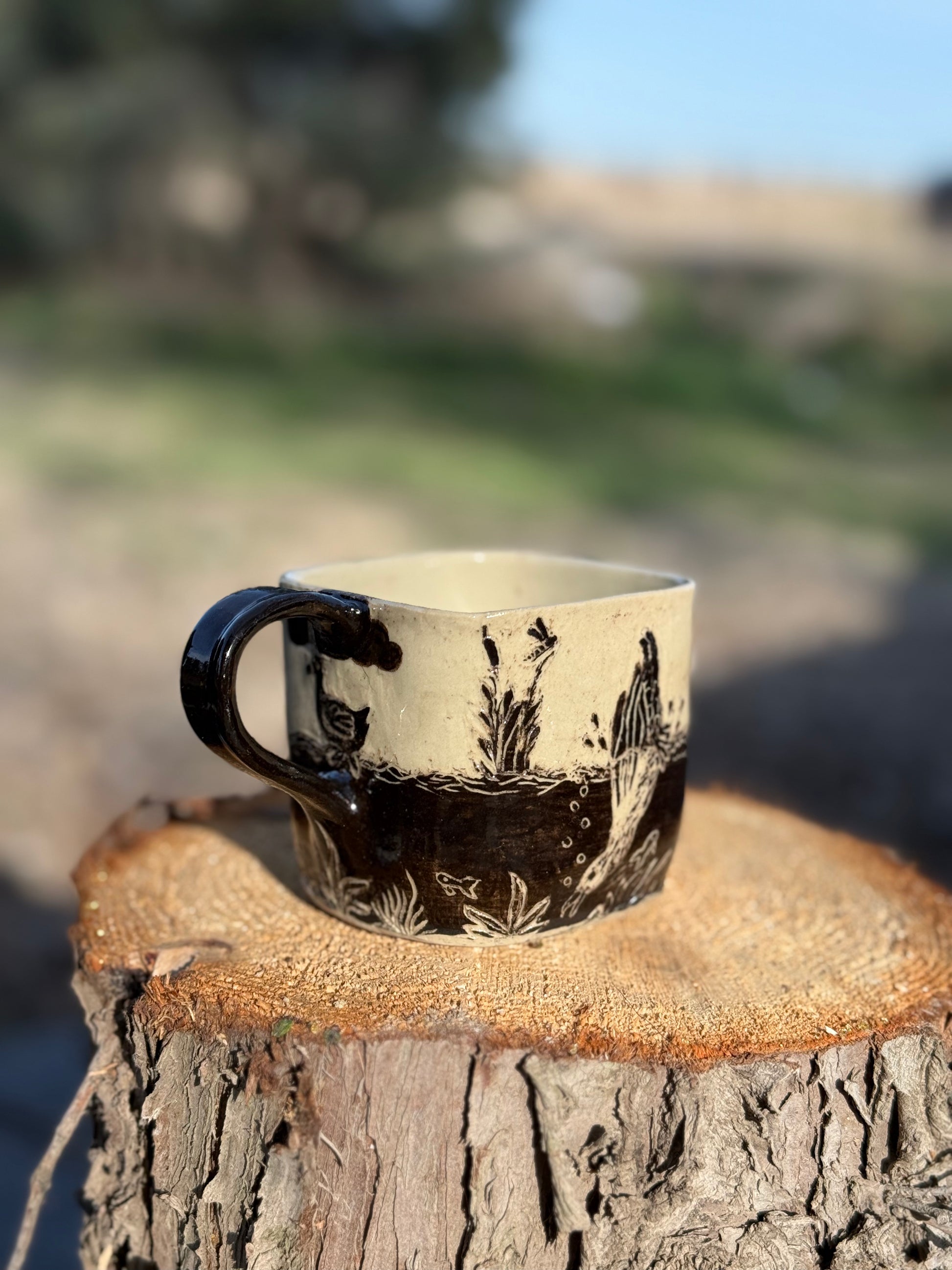 This mug was thrown on a pottery wheel, painted, and carved by hand. It features a unique "above and below" look at a dabbling duck!