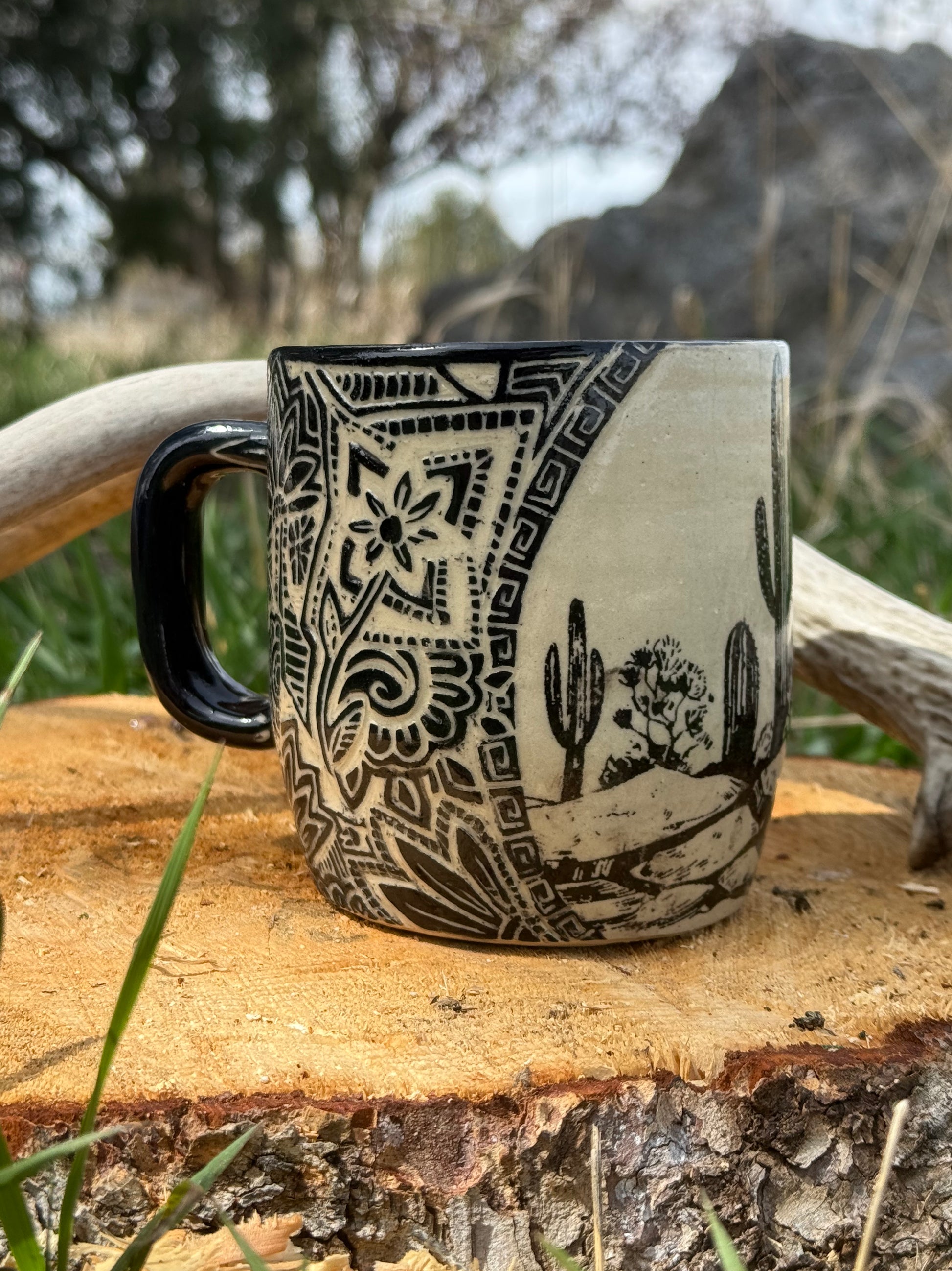 This mug was thrown on a pottery wheel, painted, and carved by hand. It features a desert scene surrounded by my signature "zendoodle" designs.