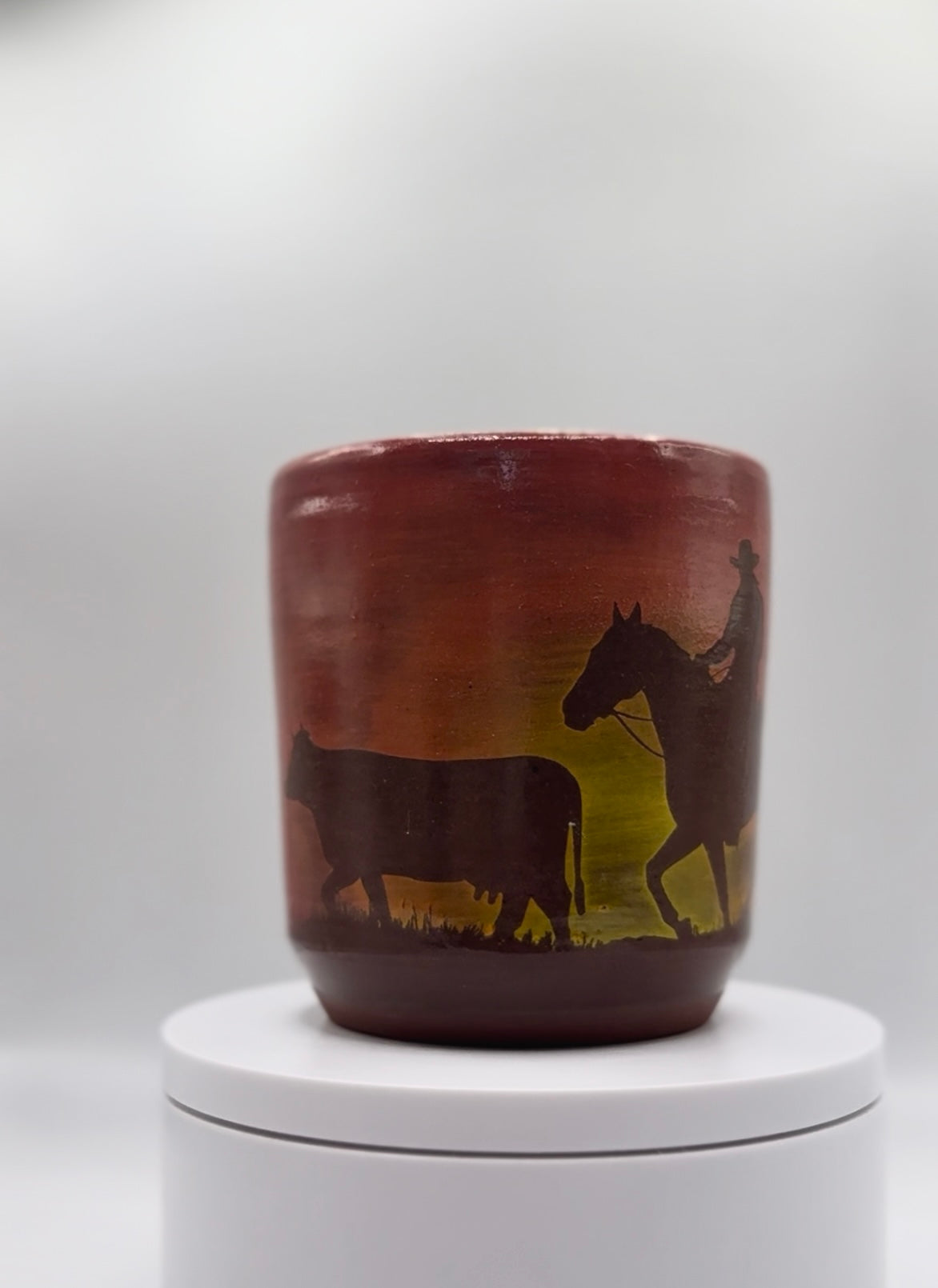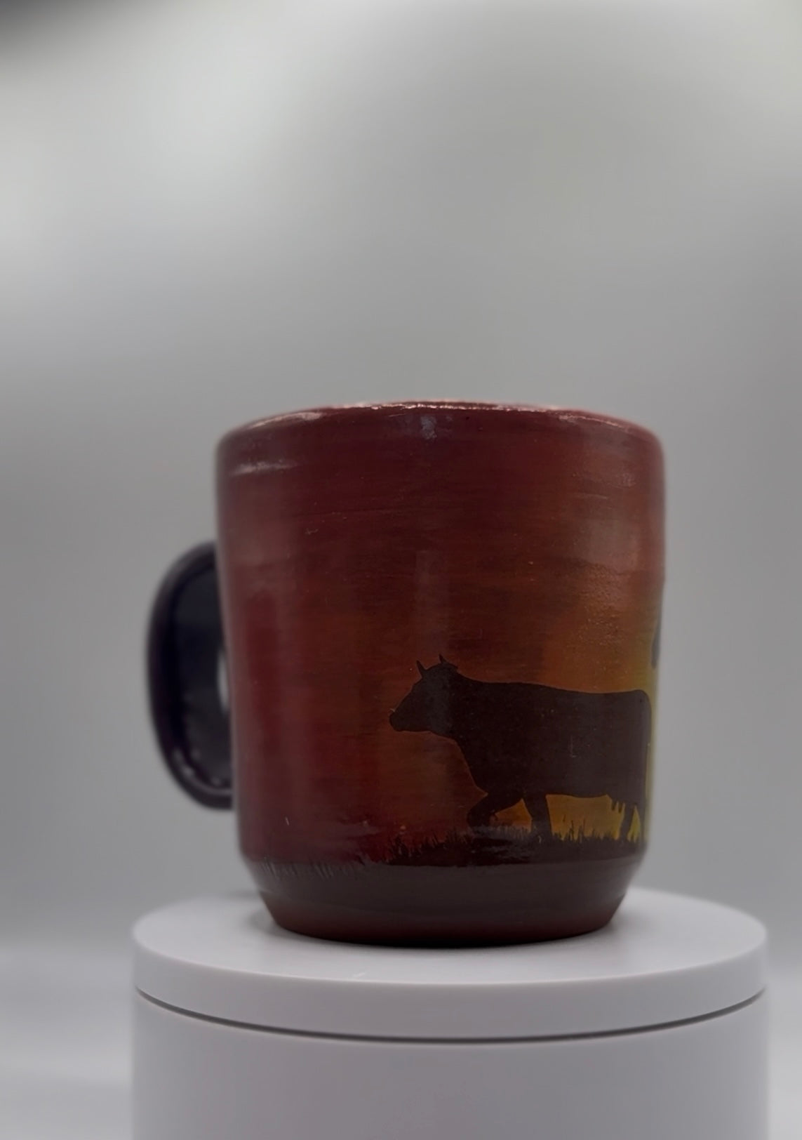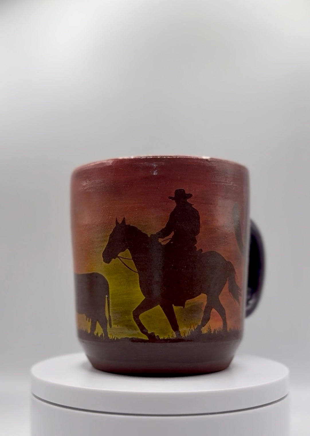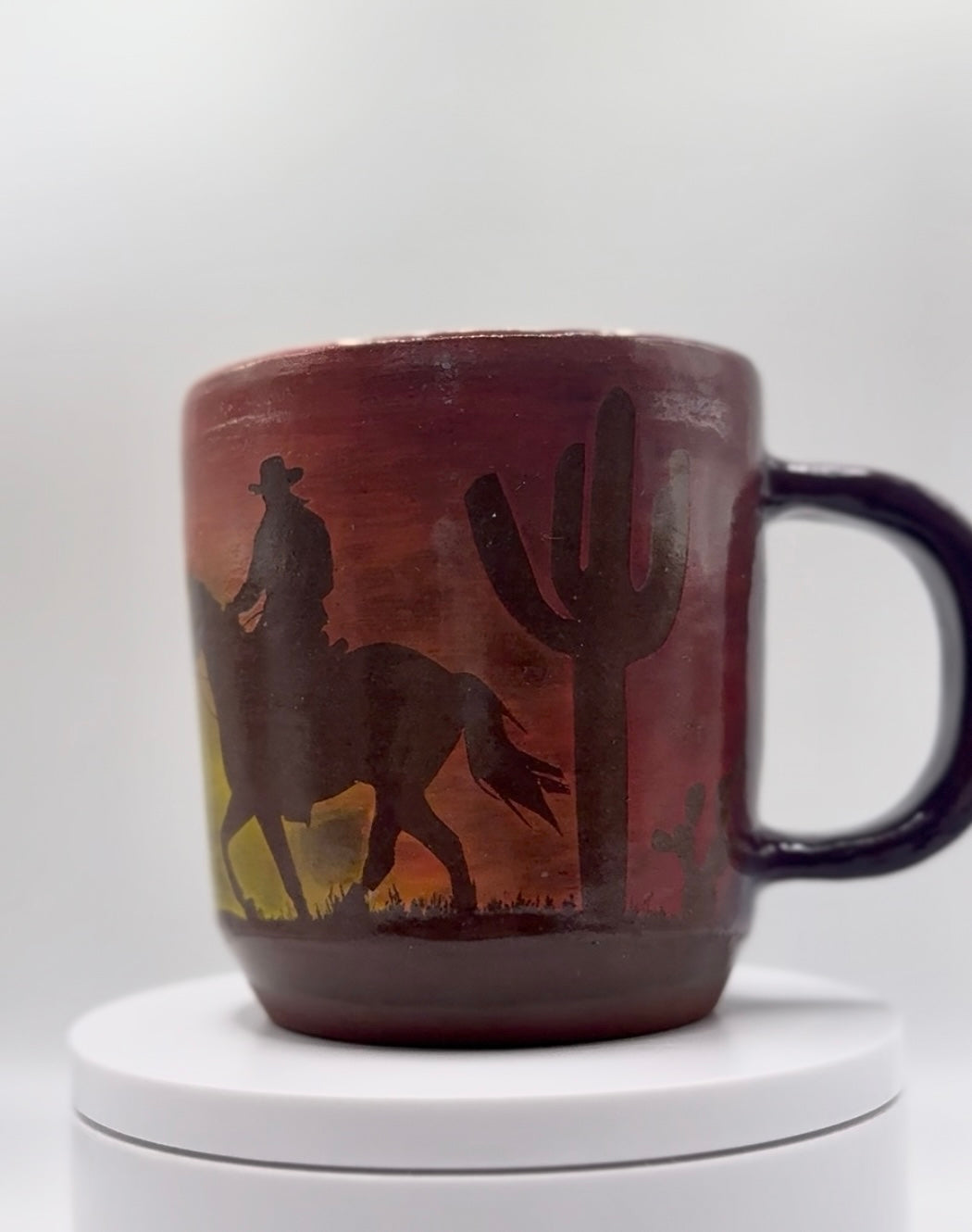 Each mug is hand-thrown on the pottery wheel, hand-carved, and hand-painted by the artist. Just like horses and sunsets, no two are exactly the same.